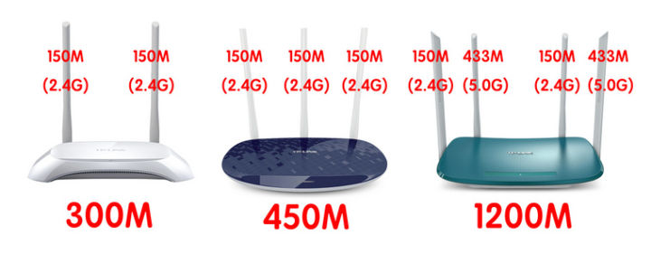 因此大多数300M的无线路由器都是2根2.4G的天线,而450M的就是3根2.4G的天线。而1200M的双频路由器,是两根2.4G的天线(300Mps)+2根5.0G的天线(867Mbps)≈1200M。