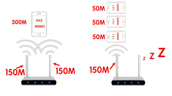 比如说你的路由器是2根天线的2×2MIMO,如果你的手机也支持2×2MIMO,那么路由器会用两根天线同时给手机传送数据;如果你的手机是1根天线的,那么它也只能用到路由器的1根天线,速度会比2根天线的慢一半。这个时候路由器其他的天线都是在偷懒的。