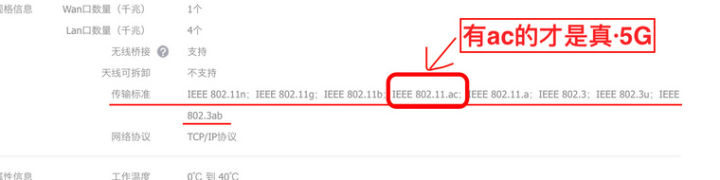 那么大一坨都不用看,都是老旧的标准,速度慢。而802.11.ac是现在最强、最快的,有这个的才是真正的5g路由器,购买时认准802.11.ac就可以了。
