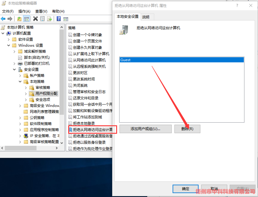 (1)、计算机配置->Windows设置->安全设置->本地策略->用户权限分配->拒绝从网络访问这台计算机->删除Guest