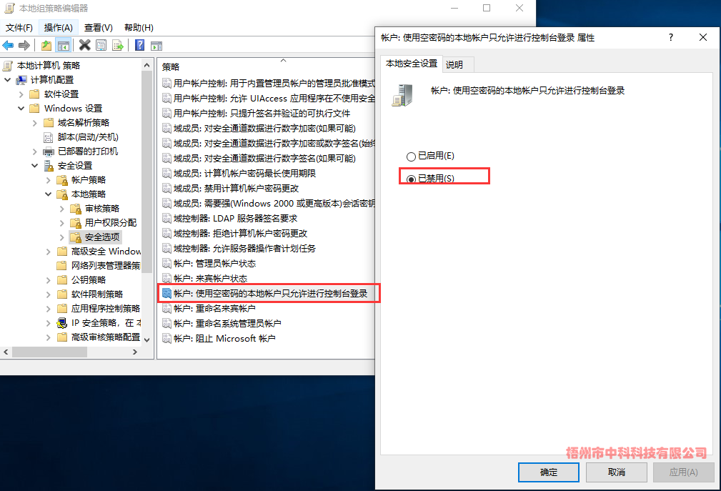 (2)、计算机配置->Windows设置->安全设置->本地策略->安全选项->帐户:使用空密码的本地帐户只允许进行控制台登录->已禁用