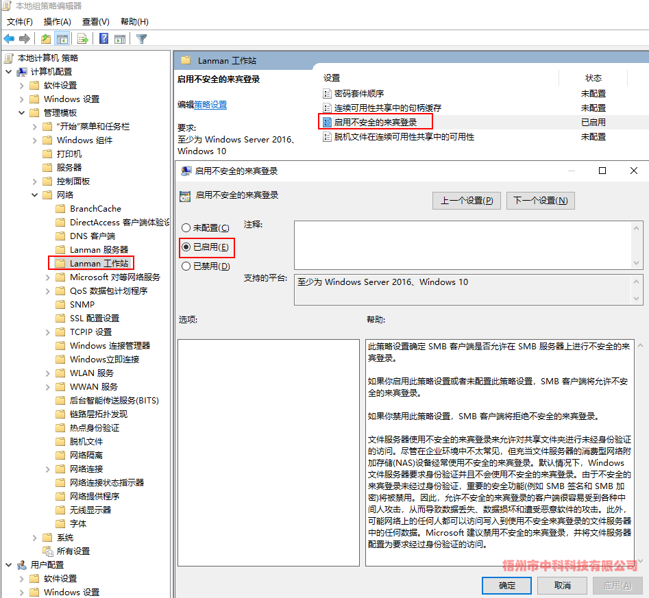 (3)计算机配置->管理模板->网络->Lanman工作站->启用不安全的来宾登陆->已启用