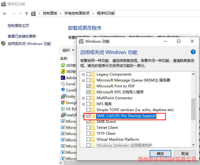在控制面板中,打开“程序和功能”->启用或关闭Windows功能->将“SMB 1.0/CIFS File Sharing Support”勾选->确定